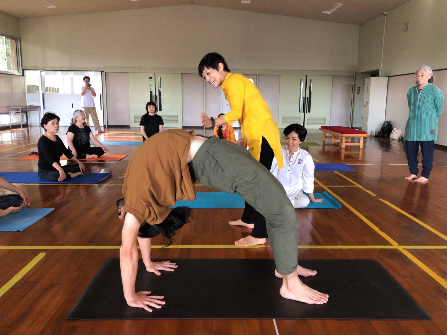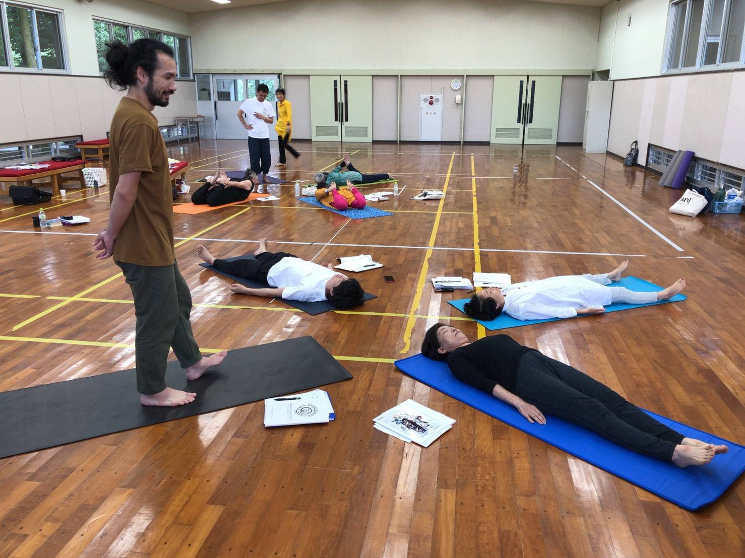 今年も、基礎編を終えた仲間が熊本阿蘇国立青少年交流の家に集まり、8泊9日間の「応用編」がスタートしました。オリエンテーションでは所員の先生によるアイスブレーキングから始まり、わずか一瞬にして心がほぐれ、交流の輪ができました。「さすが!」の一言でした。約100時間の基礎編を経て、寝食共にしながら応用編100時間を学ぶ、ヨーガを系統立てて何故学ぶのか、スタイルヨガによる一過性、ヨーガが流行によるものではない、そのことを定義でもう一度押さえ、実践で理解を深めてもらいました。特に理学療法士の有田の授業は、解剖学視点でその意味を更にクリアーにさせてくれ、彼女がスワーミー・クヴァラヤ―ナンダの「ヨーガ・セラピー」を何度も熟読、自ら実践して、プレゼン、ビデオ映像で捉えさせてくれたことによってパタンジャリのそれぞれの定義が現代科学の視点、解剖学の視点から見ても的確なものであった、そこに気づくヒントを与えてくれました。アーサナを行う時、大脳を使ったアライメント調整であらば、それはパタンジャリの定義から大きく離れたものであり、ヨーガのアーサナからも離れていくものだと思っていいでしょう。その意味がわかるようになるには、定義に沿ってアーサナを淡々と行うことです。ヨーガのスキルはやはりそう簡単なものではありません。それを正しくやる手順や、それに向かう勇気や根気強さもいります。「真面目さ」は必要ないですが、、、
