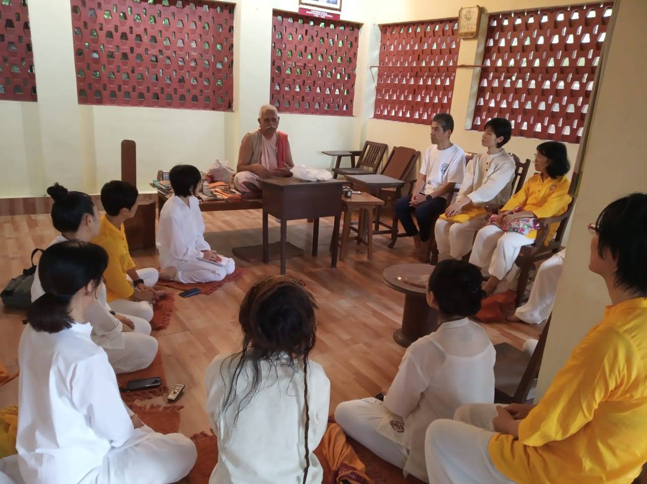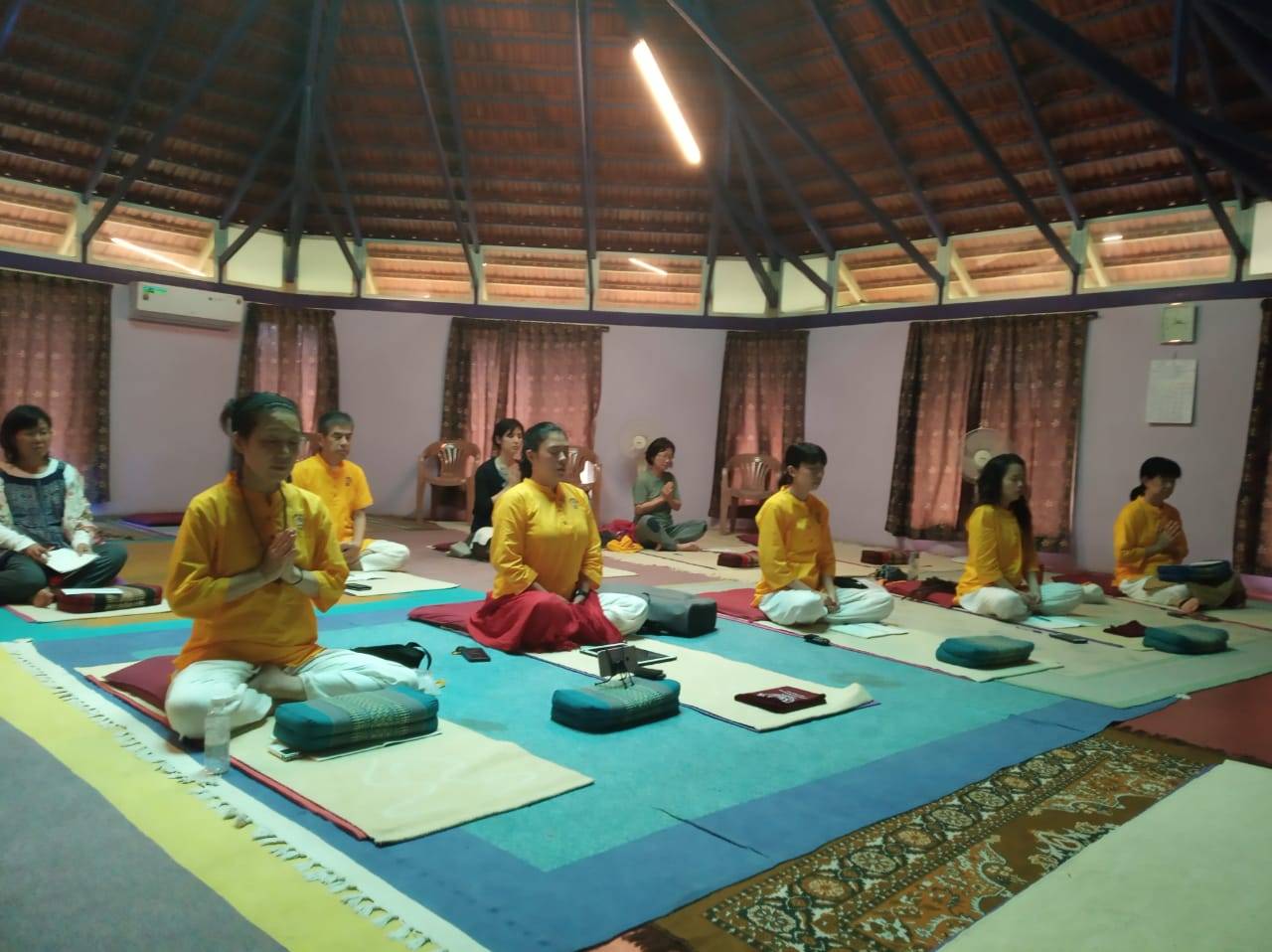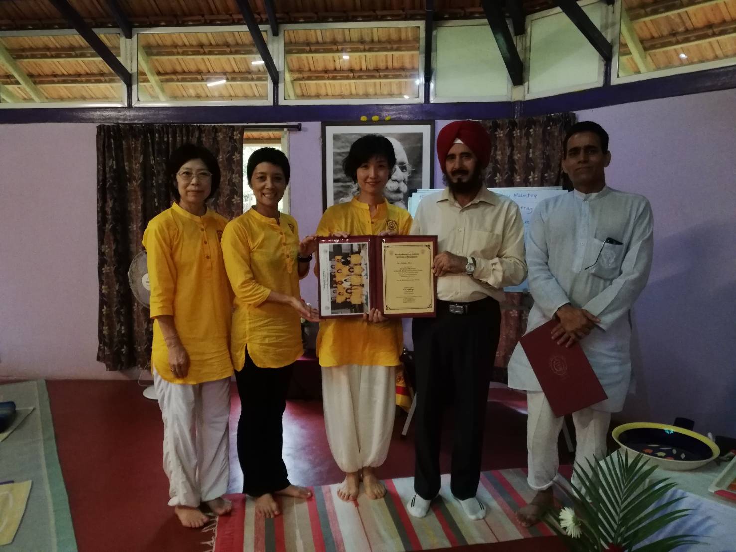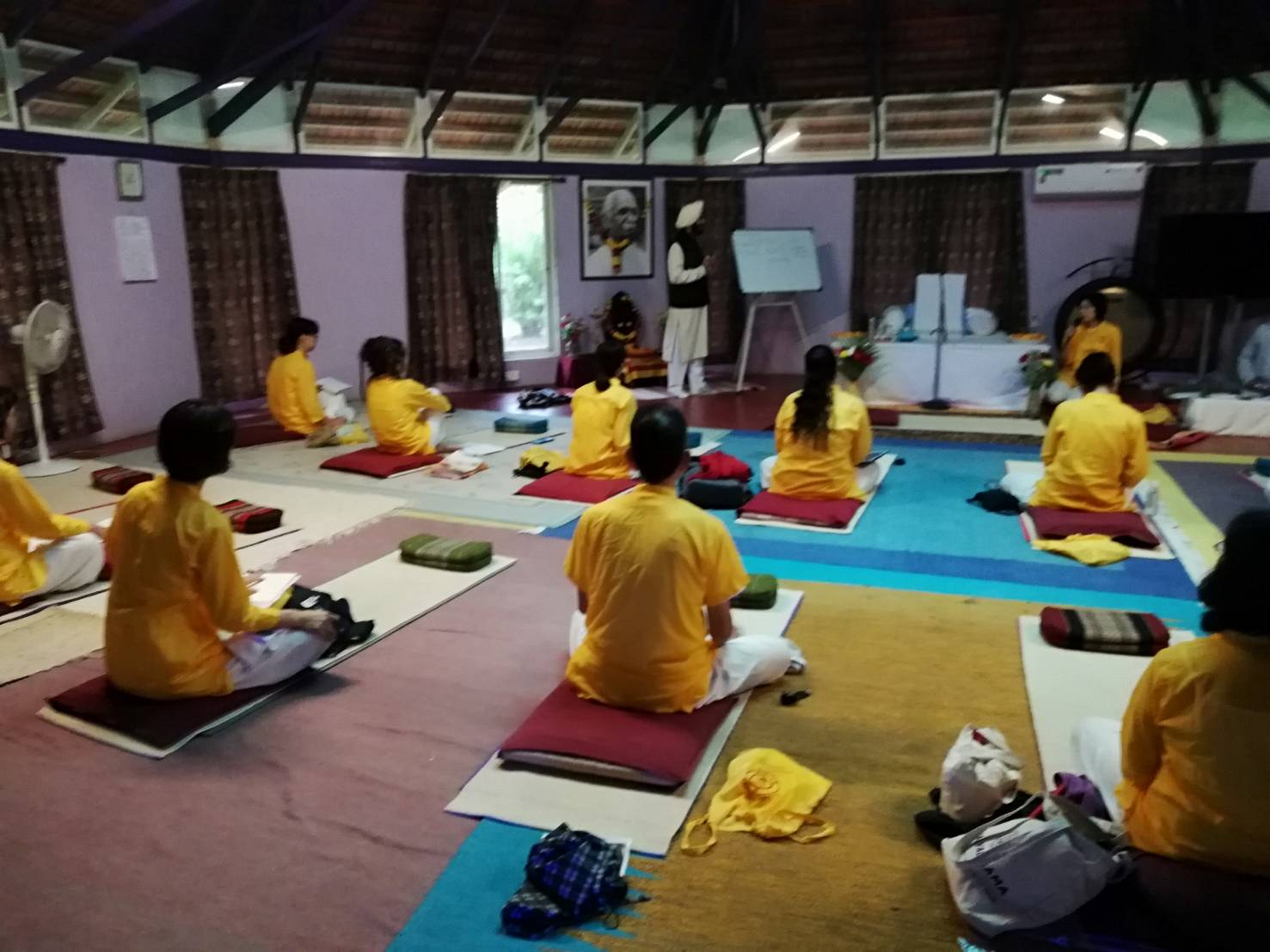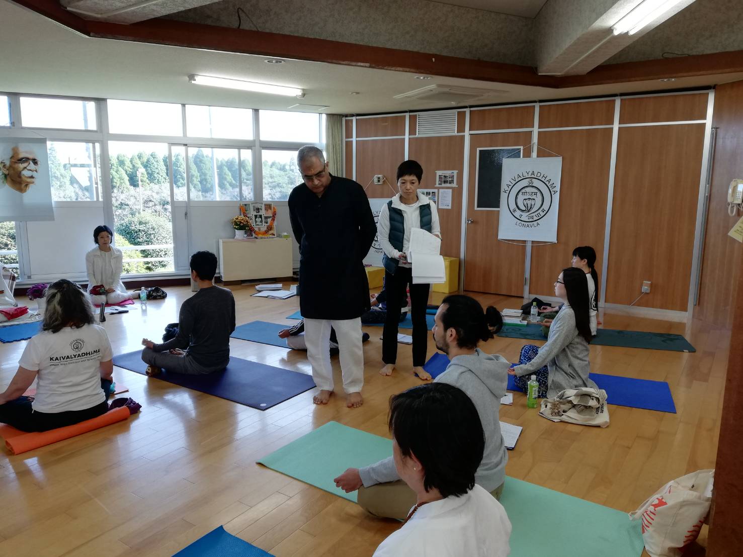 阿蘇での応用編の3日後には、仲間を連れてインド、ロナワラにあるヨーガの故郷kaivalyadhamaへ・・・初めてこの地に来る方、何度か訪れたことがある方、様々な思いでの方々が集いました。この講義内容を受講するにあたってのやはり基準があり、今回は古典ヨーガの基礎があり、実習をしている方、またCCYの授業を経ている方々の参加ということで、講義内容が想像以上に深かったです。その内容をここに記すことは出来ませんが、「瞑想をしています」と言われるときに、この時点で、もっとそこから遡って基本の内容を押さえなければいけません。世界中で行われているのは、Dharana(集中)である、ヴィパッサナーやマインドフルネスも瞑想だと言われているが、それらはその準備・・・そのような講義から始まって、古典書の講義と実習が繰り返されました。私が留学していた当時の校長がボガール教授であり、当時は聞けなかった貴重な体験話をされ、思わず胸が熱くなりました。やはり、何かを極めていくときには、当然そこへの批難、批判、苦悩、様々の(周りはいろいろなことを言いますから)・・・それを経験しながら「超越」の体験の準備ができると。ヨーガは、その「超越」に向かうものです。それは苦楽や、好き嫌い、いい悪いであったりの対比の経験から、そこを繰り返し経験し、そこに執着し、また苦に陥り、そこを観察できるようになるところか始めて、いわゆる「気づいておく」ことから、瞑想への道のりはいきなりジャンプ(薬や誰かからその体験を得ようとしたり)はできない、ヒマラヤの洞窟にこもったり、世間から逃げたりしても「超越」には至らない。今回、私たちは、そこに向かう準備、その具体的な実習法と、それがどの文献にあるものか、サンスクリット語文の意味を読み解き、Diplomaの講義でも習うことのない、また体験することのない貴重な内容を惜しみなく与えてもらい、皆さんそれぞれが感激、感謝されていました。